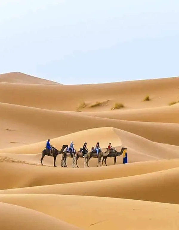 A magical journey through the Atlas Mountains, palm-filled valleys, and dramatic gorges, ending in the golden dunes of Merzouga. Enjoy a premium desert camp stay, sunset camel ride or 4×4 option, and stargazing under the Sahara sky.